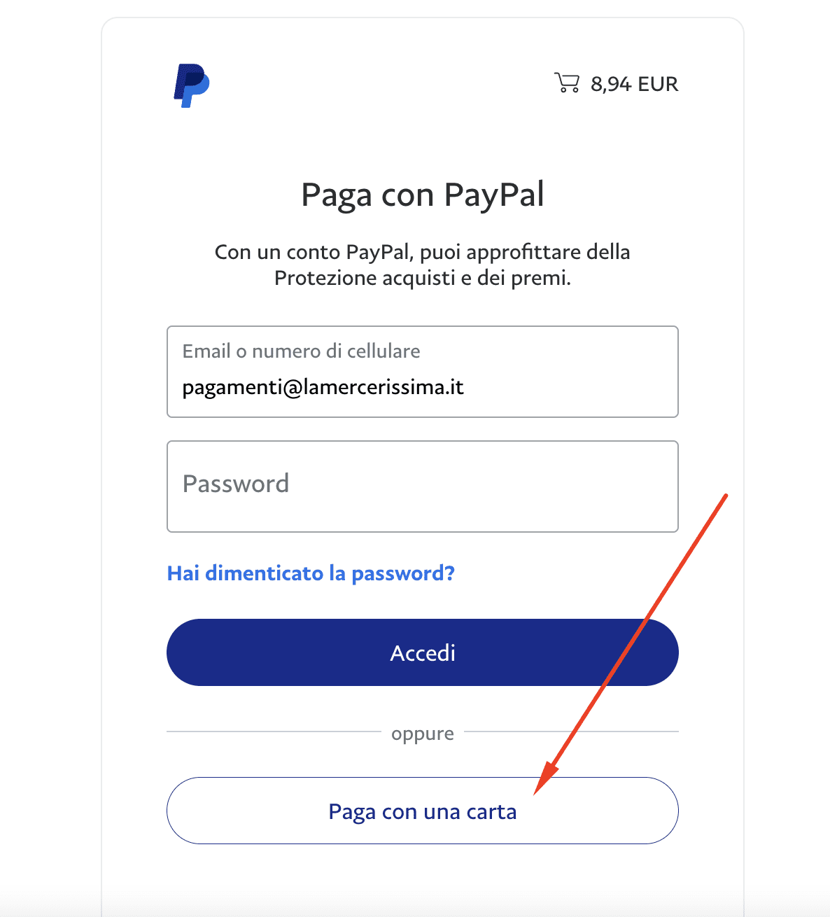 - Nella pagina che si apre (vedi immagine qui sotto) selezionare Paga con una carta