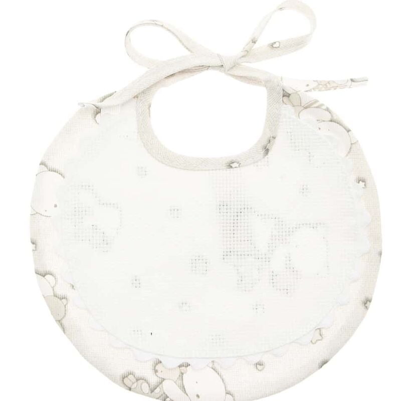 Bavaglino 3/6 mesi rotondo con tela aida per il ricamo a punto croce. Disponibili tre colori: rosa, celeste, beige. Quest'ultima versione ha la tela aida ecrù, mentre gli altri bianca. Diametro 20 cm circa.