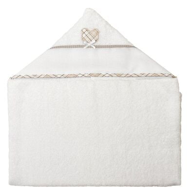 L'accappatoio presenta una striscia di tela aida dall'altezza di 10 cm circa, ed è realizzato interamente in spugna bianca. Morbido, comodo e pratico per i bagnetti del tuo bambino. Misura 60x100 cm
