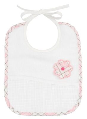 Grazioso bavaglino adatto per i bimbi dai 3 ai 6 mesi. La rifinitura sul collo ha la fantasia a pois, la rifinitura esterna ha una fantasia a tema scozzese. Al lato de bavaglino, un cuore che richiama il tema scozzese della rifinitura del bordo. Realizzato in 100% cotone con una banda di tela aida variante dagli 6 ai 10 cm circa.