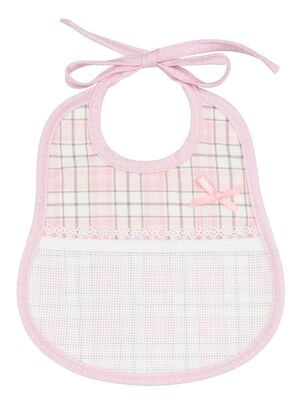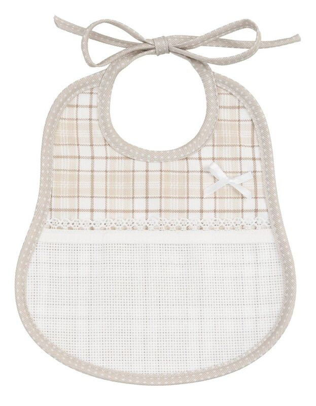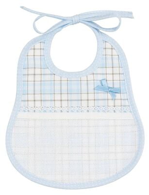 Bavaglino da ricamare a punto croce realizzato con tessuto in cotone fantasia tipo scozzese, tela aida per il punto croce, e piccolo merletto di rifinitura sul bordo di aida. La misura è indicata per neonati 0/3 mesi circa.