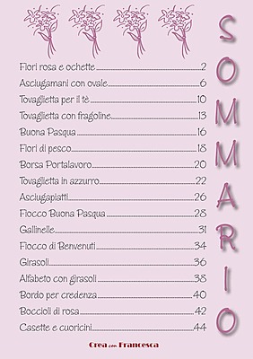 Con l'arrivo della primavera c'è sempre tanta voglia di dedicarsi alla casa, alle sue decorazioni e abbellimenti. Cosa c'è di meglio per noi amanti del ricamo a punto croce di una nuova serie di schemi pronti da ricamare? In questo libretto ci troverete moltissimi idee per decorare asciugapiatti per la cucina, tovagliette, tendine e asciugamani. In generale contiene schemi a colori per bordure che poi potete scegliere di ricamare dove volete. Il tema predominante è appunto la primavera con tanti schemi dedicati ai coloratissimi fiori. Ma si trovano anche paperelle, frutta, coniglietti e tanto altro.